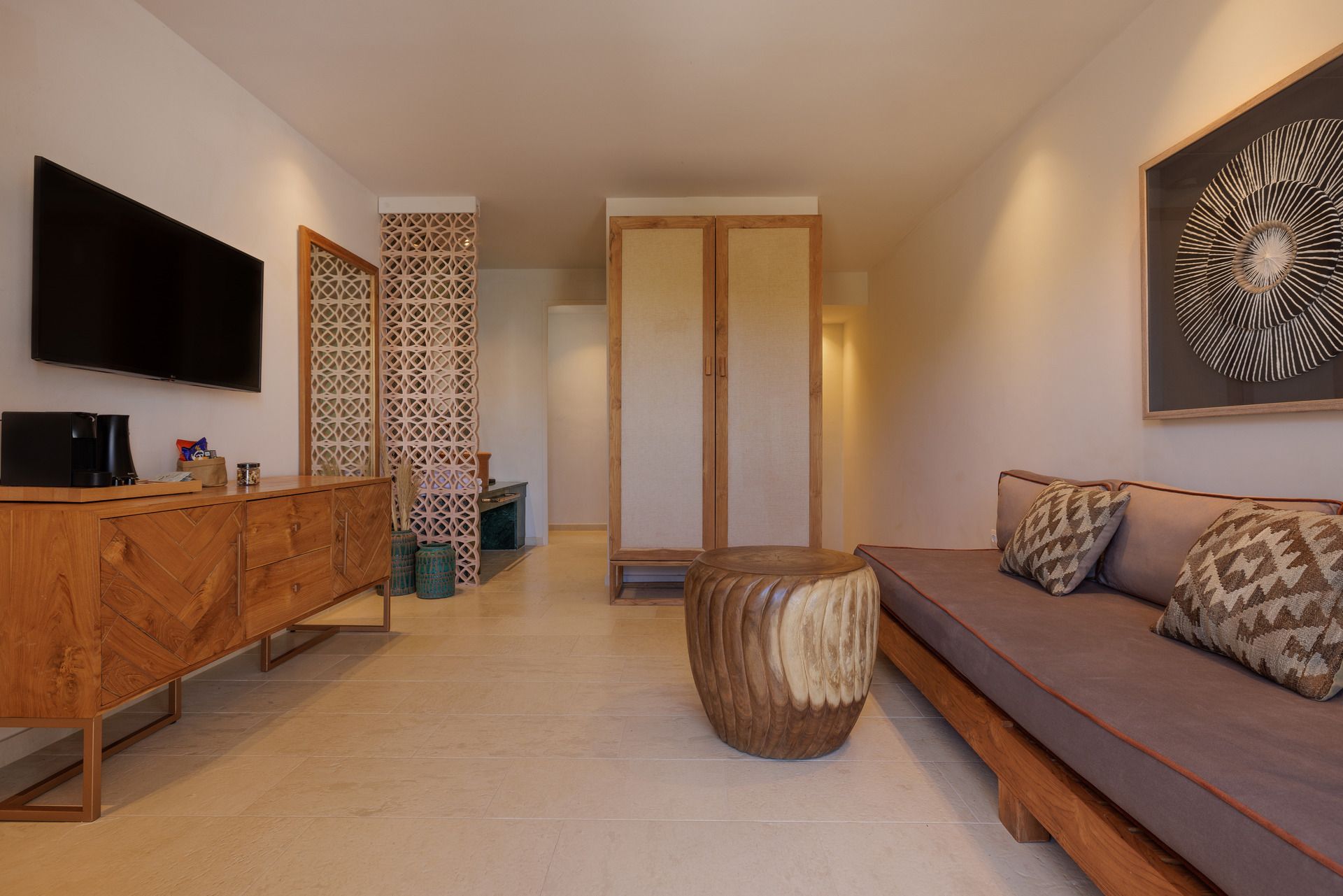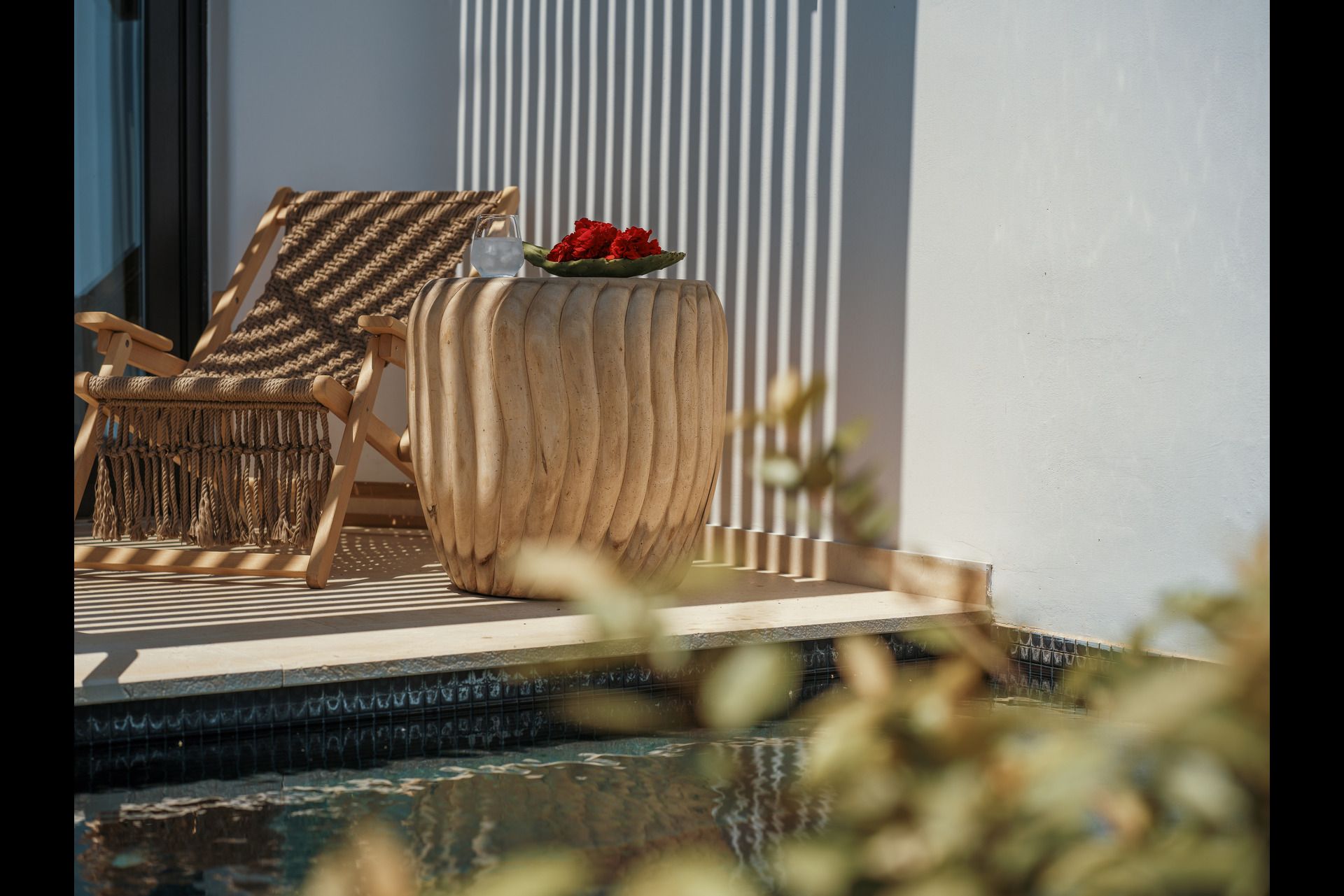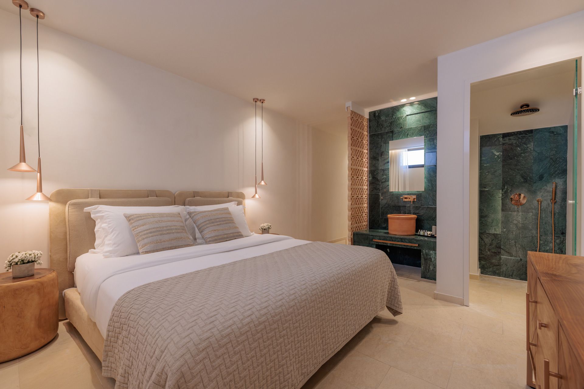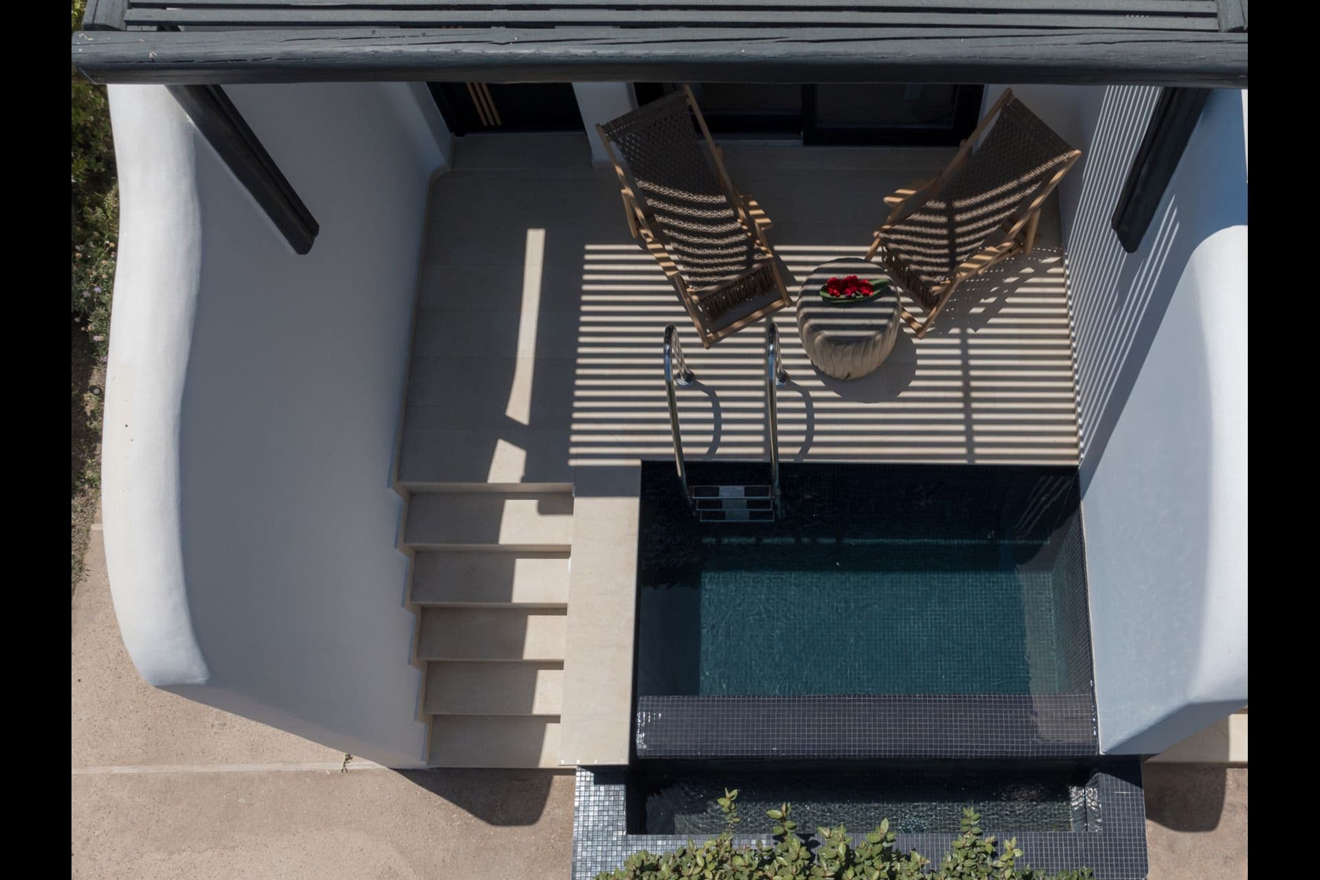 Our Superior Maisonettes with Plunge Pools have two floors of exquisite architecture and range in size from 55m2 to 60m2. Each apartment has marble walk-in showers, double ceramic sinks, and a private pool area. Your stay will be enhanced by modern amenities, a minimalist ambiance, and a smart TV app that allows you to book our services. You may also brew beverages anytime you like with the in-suite coffee machine. The mix of comfort and minimalistic design will allow you to unwind and enjoy the tranquility of the island.