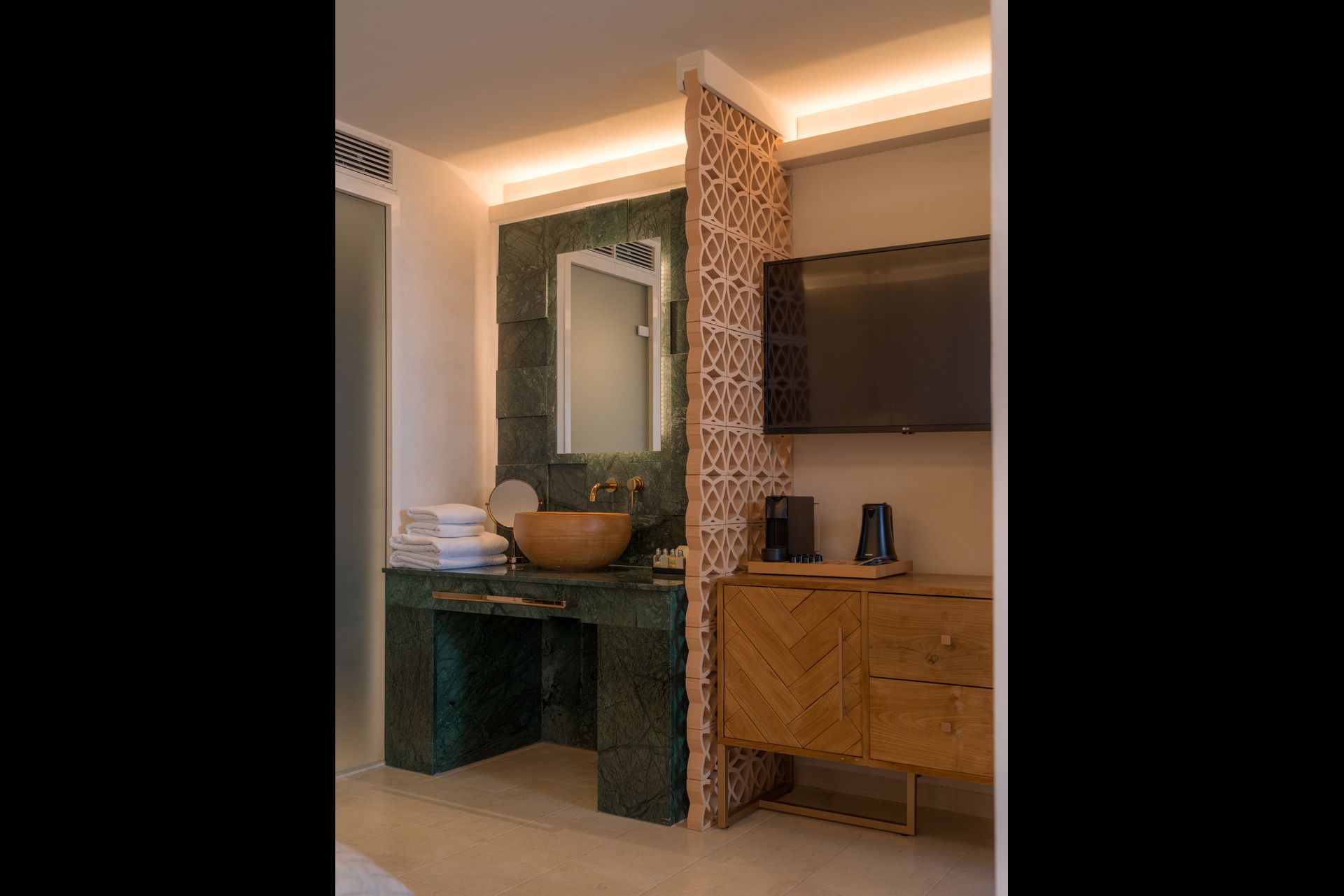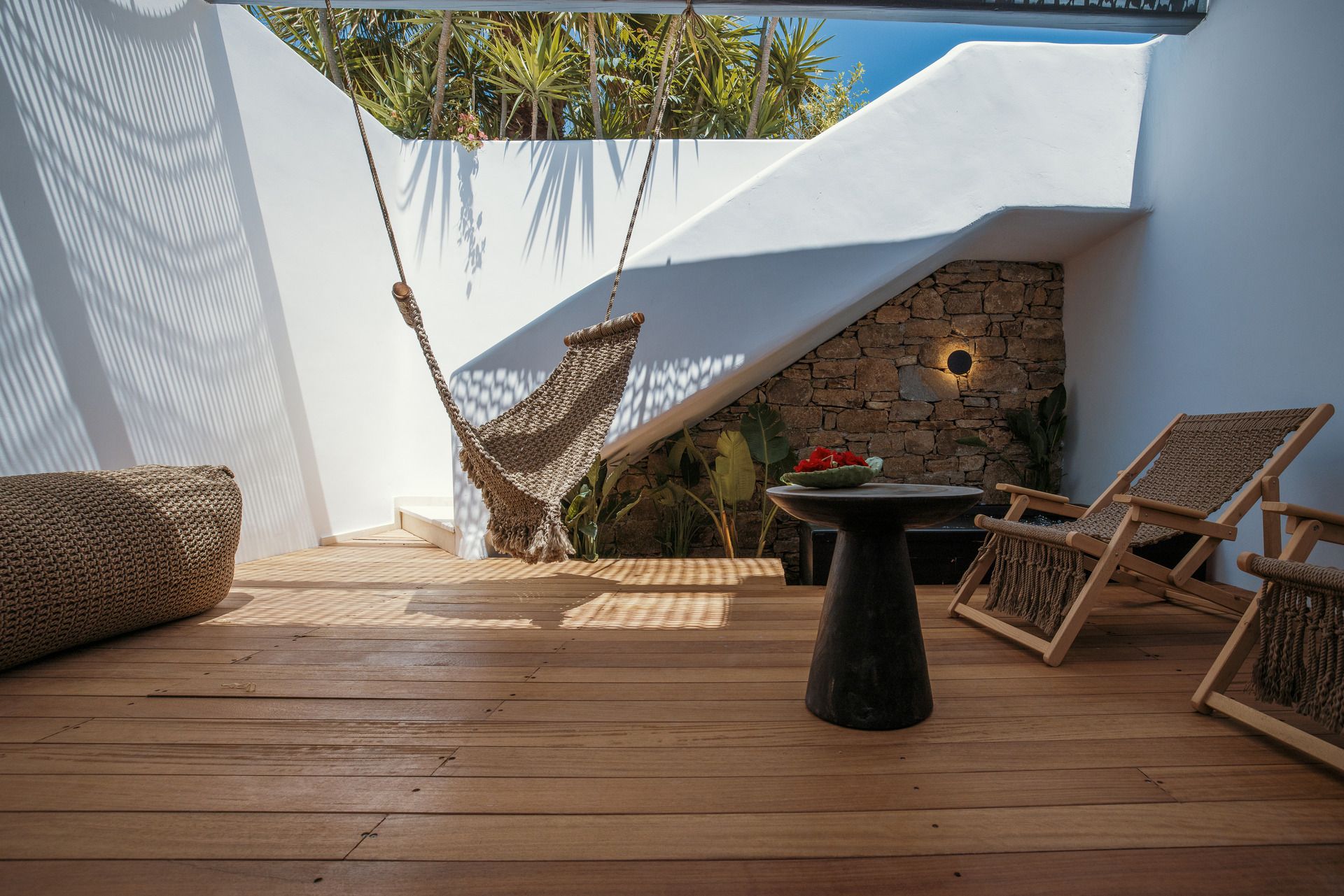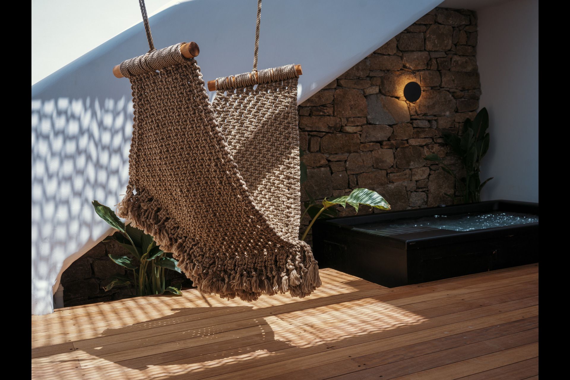 Our Superior Double suite with an outdoor Jacuzzi will make your stay a stress-free and luxurious experience. This 55m2 room has a private terrace with a Jacuzzi and is designed in a Boho chic manner. For a modern, pleasant stay, it also has high-tech appliances, a marble walk-in shower, and ceramic double sinks. Furthermore, the room is outfitted with a king-sized bed and all of the conveniences required for a comfortable stay. Housekeeping services are also provided for your convenience. Make a reservation or order from the comfort of your room using the smart TV app, and then relax with a cup of coffee or tea. Enjoy an exceptional luxury experience at Mykonos' most distinctive and noteworthy hotel.